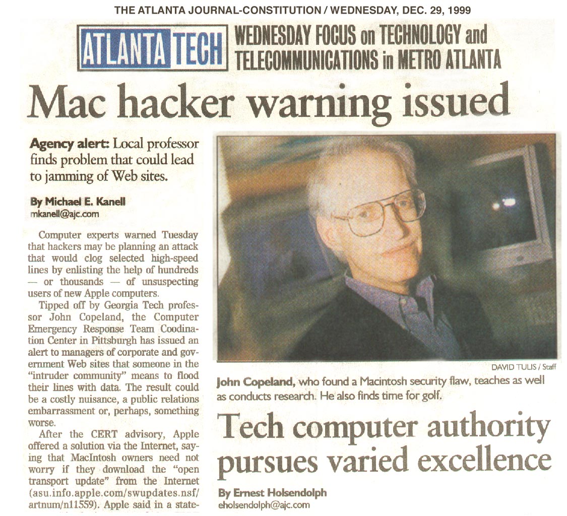 His background and credentials uniquely suited him to be the one who made the connection between a flaw in the MacIntosh OS9's security and the possibility that an intruder could use it to attack computer networks. Copeland has been awarded some 37 patents, and his publications are familiar to the technology research community.