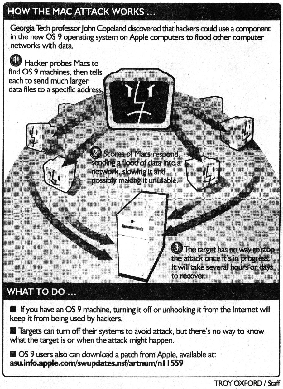 Then something else clicked for him. The latest operating system from Apple - Macintosh OS 9 - has a feature that could be misused. A Mac running OS 9 can be used as a "data amplifier." An OS 9 machine will respond to a certain kind of data packet or message that triggers it to send a much larger, 1.5 megabit, packet of its own to wherever it is told to send it.